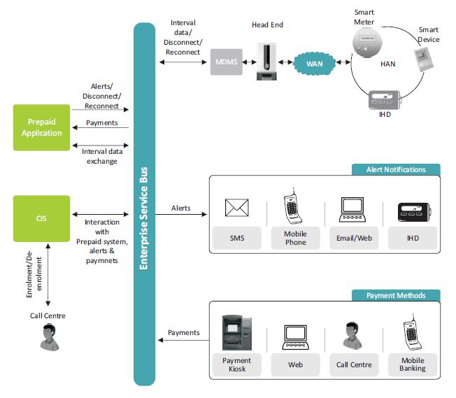 With Smart Grid and Advanced Metering Infrastructure (AMI) in place, Utilities do not require prepaid meters to serve the prepaid customers. A simple smart meter with remote connect-disconnect switch can perform the function of prepaid meter. With powerful interval data available at Utility's disposal, Utility Application(s) can calculate the credit left on the prepayment account and can initiate necessary actions like generating alerts, performing disconnect/reconnect etc. With the below architecture in place, many of the disadvantages of the existing prepayment metering system would be addressed.
