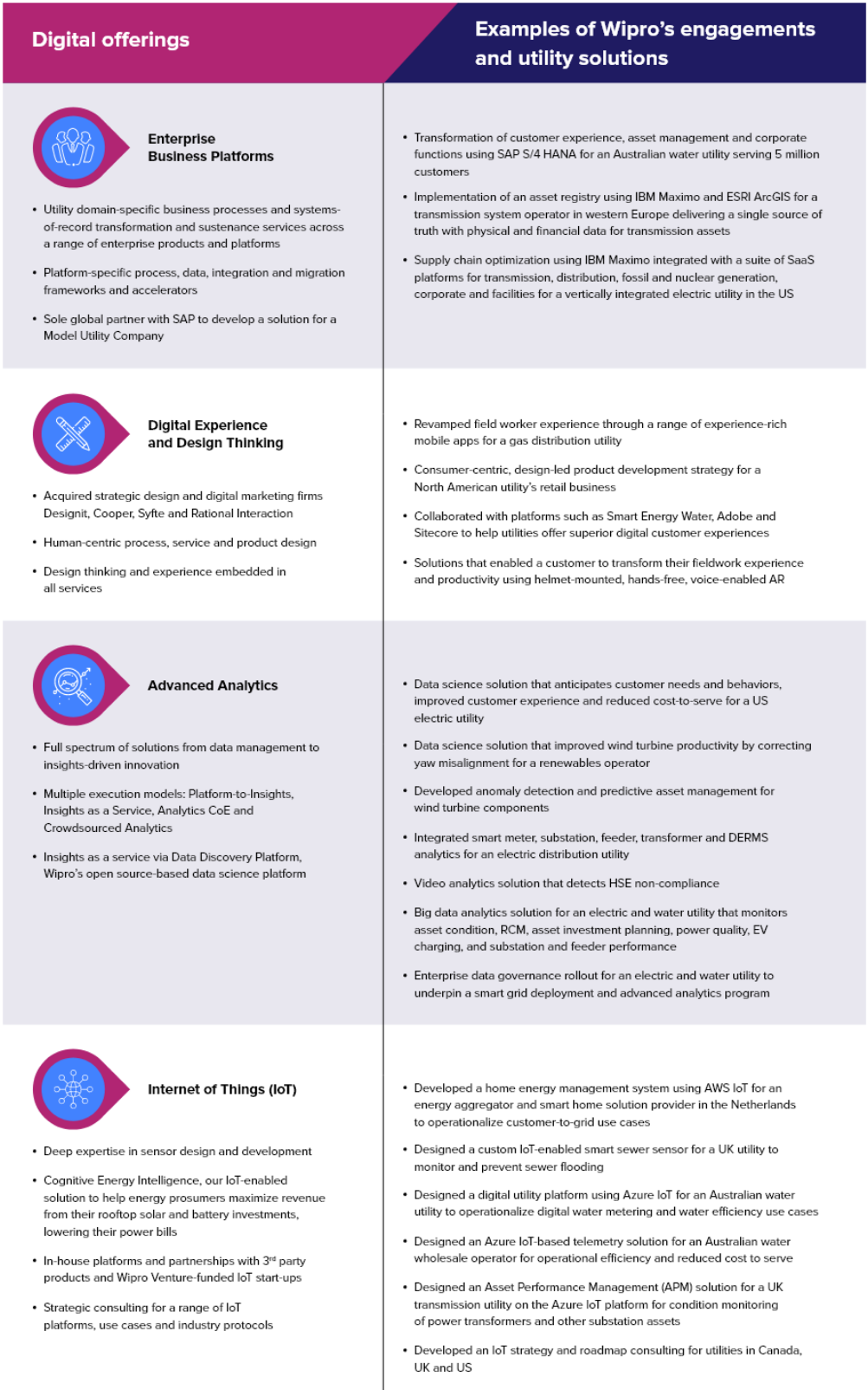Our utility clients partner with us to strengthen their core operations through process and platform transformation. Additionally, they are leveraging Wipro’s digital offerings to amplify business outcomes in four critical areas: Safety, Operational Effectiveness, Customer and Employee Experience, and Revenue Growth.