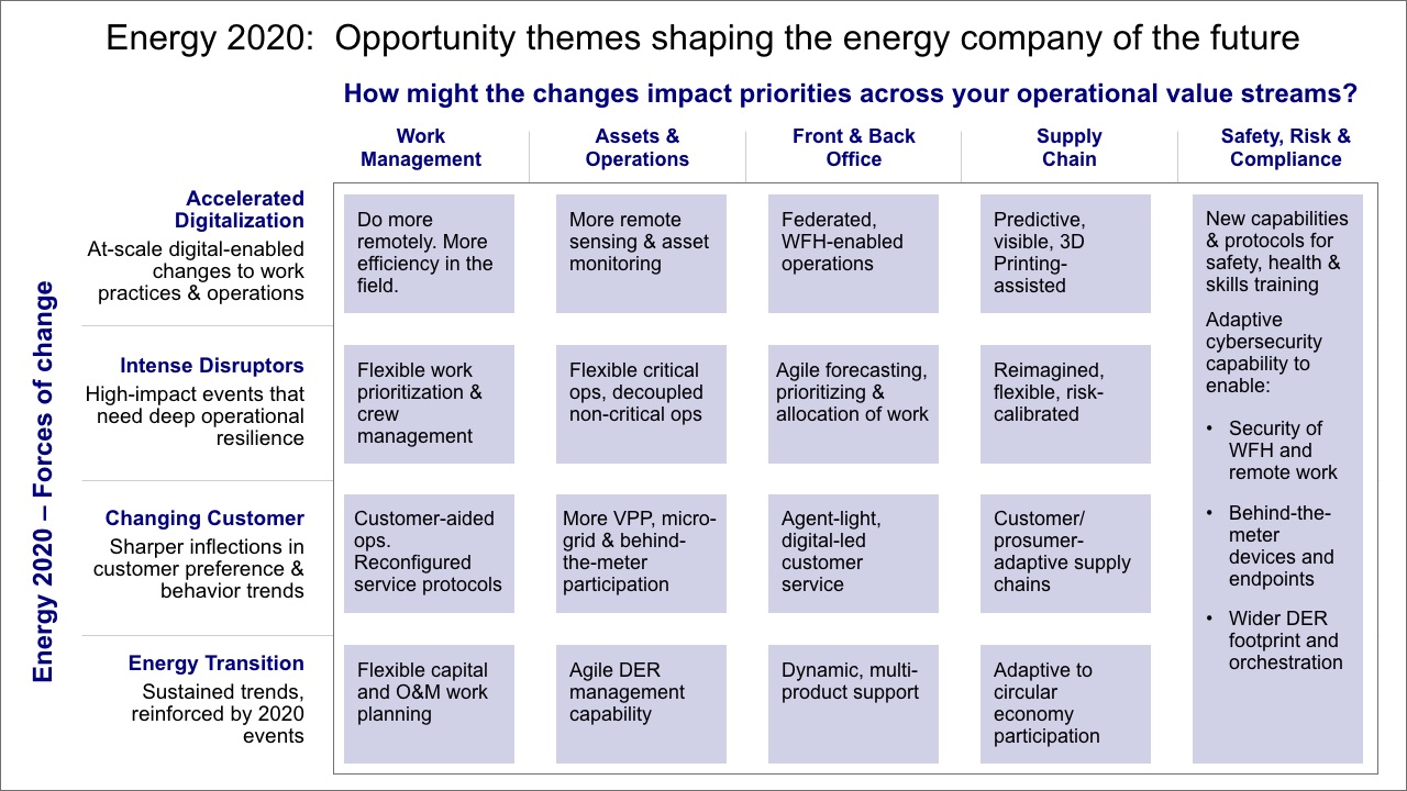 Energy 2020 will accentuate four transformational forces of change – Accelerated Digitalization, Intense Disruptors, Changing Customer, and Energy Transition – that present abundant opportunities to shape a future-ready operating model across your key value streams including assets, work, operations, front and back office, supply chain, health and safety, and risk and compliance.