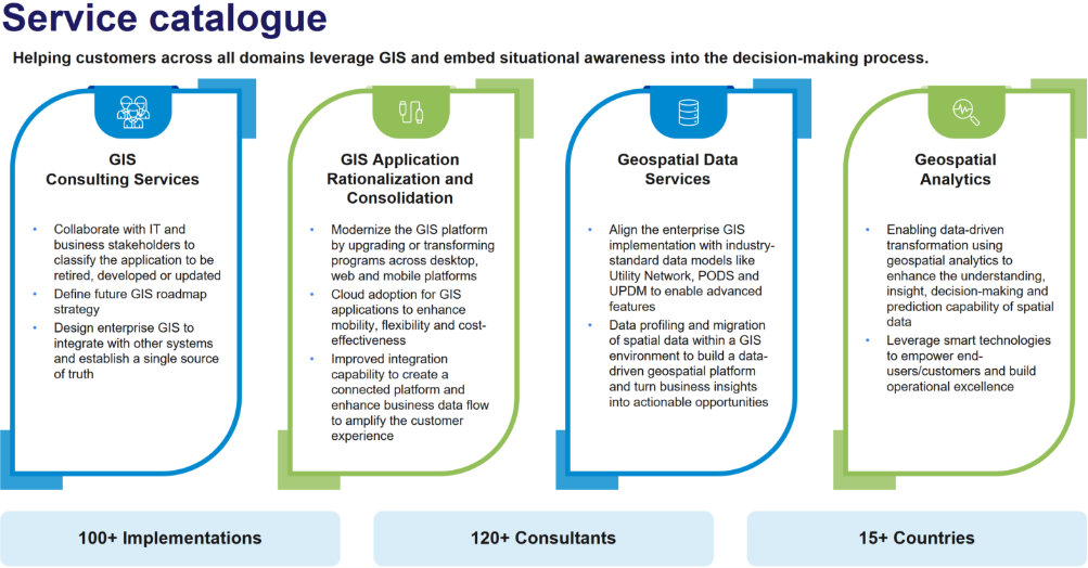 Wipro’s GIS team includes 120+ GIS consultants with expertise across various industries and geographies. Our experience empowering businesses with locational intelligence has made us a preferred System Integrators in the GIS space. Our GIS practice consultants have expertise in conceptualization techniques and geospatial solutions. About 75% of our GIS engagements are on the ESRI platform. However, Wipro also has implementation capabilities around various GIS products like Autodesk, MapInfo, GE Smallworld, Intergraph and others. The graphic is a representation of our services: