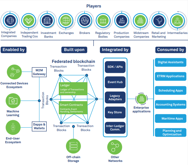 The major players presently in the system will manage the blockchain. These will be the traders, platform operators, financial services, IT service providers or other third parties. Smart, self-executing load and discharge contracts on the blockchain can lower risks and costs for shippers and carriers. Trucks will be fitted with IoT devices that measure mileage and routes, thus creating transactions in the blockchain. Business processes will no longer synchronize directly with each other, but rather via an adapter which maps process states and data onto the blockchain. Essentially, this likens the architecture, rather simplistically, to an “enterprise bus” using the blockchain as a conduit for communication and trading systems, interfaced through inbuilt chain adapters. In the short-term, the current process will be supported rather than replaced by blockchain, with standardization of data formats being a very welcome byproduct.