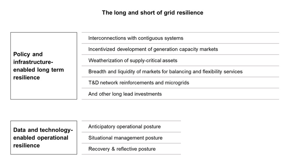A variety of capabilities goes into enabling resilience of the electric grid. Some require long gestation periods. These long-lead capabilities are typically in the energy policy, regulation and infrastructure investment domains. Investments in reinforcing transmission and distribution (T&D) networks, empowering and enabling community grids, interconnections, and deepening and broadening markets for balancing and flexibility services are examples of such long-lead capabilities.