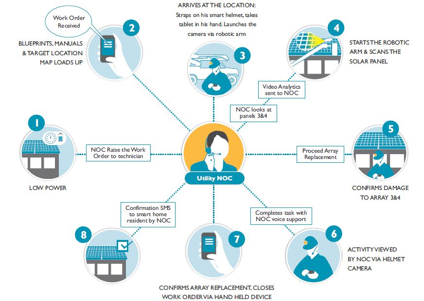 Most digital grid devices incorporate powerful processors and several components like data validations etc; of an end-to-end business process can be executed right within the device. Many such business processes can be functionally de-componetized and distributed across grid devices, the vehicle computing platform and back office. Essentially, this leads to a component architecture that is functionally distributed as opposed to stove-piped service architectures. A primary feature of this app architecture is its ability to dynamically reconfigure devices in the field to restore partial or full function capabilities. Utilities must extend the existing application portfolio to include both field and back office components so that they seamlessly align and deliver fieldwork capabilities. Back office components must include scheduling and dispatch apps. The former should prioritize work based on customer preferences, historical work crew performance and contractual obligations. The latter should initiate work based on real-time crew availability, environmental and service level agreements. All app components will embed several adaptive learning and predictive algorithms and evolve to optimize work dispatch given customer expectations and resource availability. These new age apps will work with advanced asset management and operational systems to deliver optimal work schedules. Crews will be empowered with specialized apps that can provide individualized customer experience in order to effectively improve customer satisfaction. These apps will work in tandem with communication systems that can deliver real-time work status anywhere, anytime to customers. A practical realization of a residential solar panel outage/restoration process is depicted in Figure 3.
