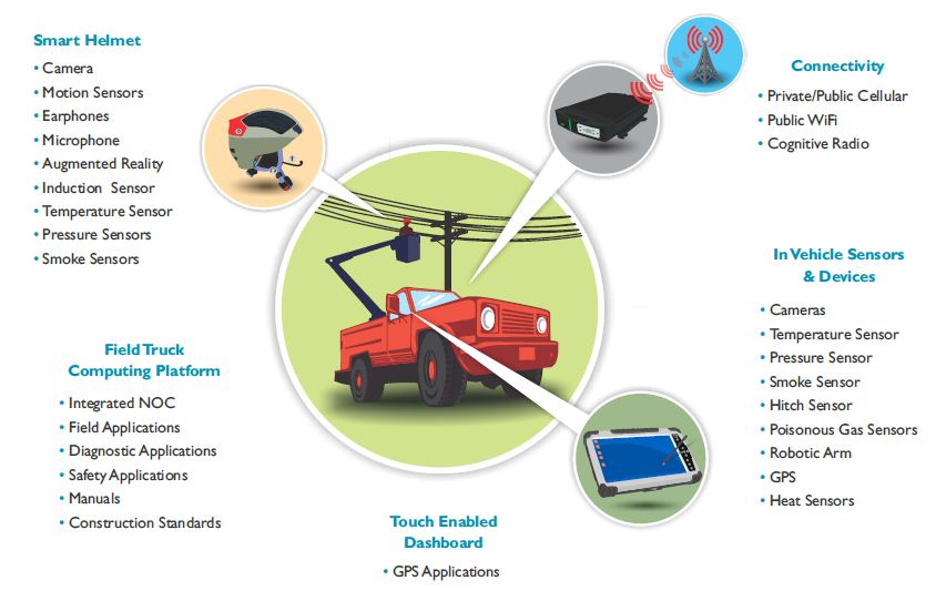 The crew productivity can be tremendously improved by strategically employing wearable technologies, to expedite work completion. The next generation work helmet will include a camera, GPS, poisonous gas sensor, accelerometer, temperature sensor and induction sensor. Most engineering design diagrams and safety manuals can be housed in the vehicle-computing platform and streamed directly to the technician’s wearable or projection surfaces as appropriate. The integrated wearable can stream real-time video from the work site to a remote diagnostic center, where an expert can help aid problem resolution. Additionally, the vehicle can be fitted with a guided robotic arm and other special devices that can help resolve technical issues such as attending to rooftop solar panels.
